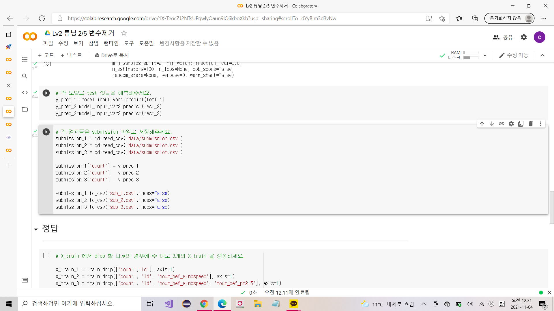 3) 각 모델로 예측한 예측값들을 submission에 저장