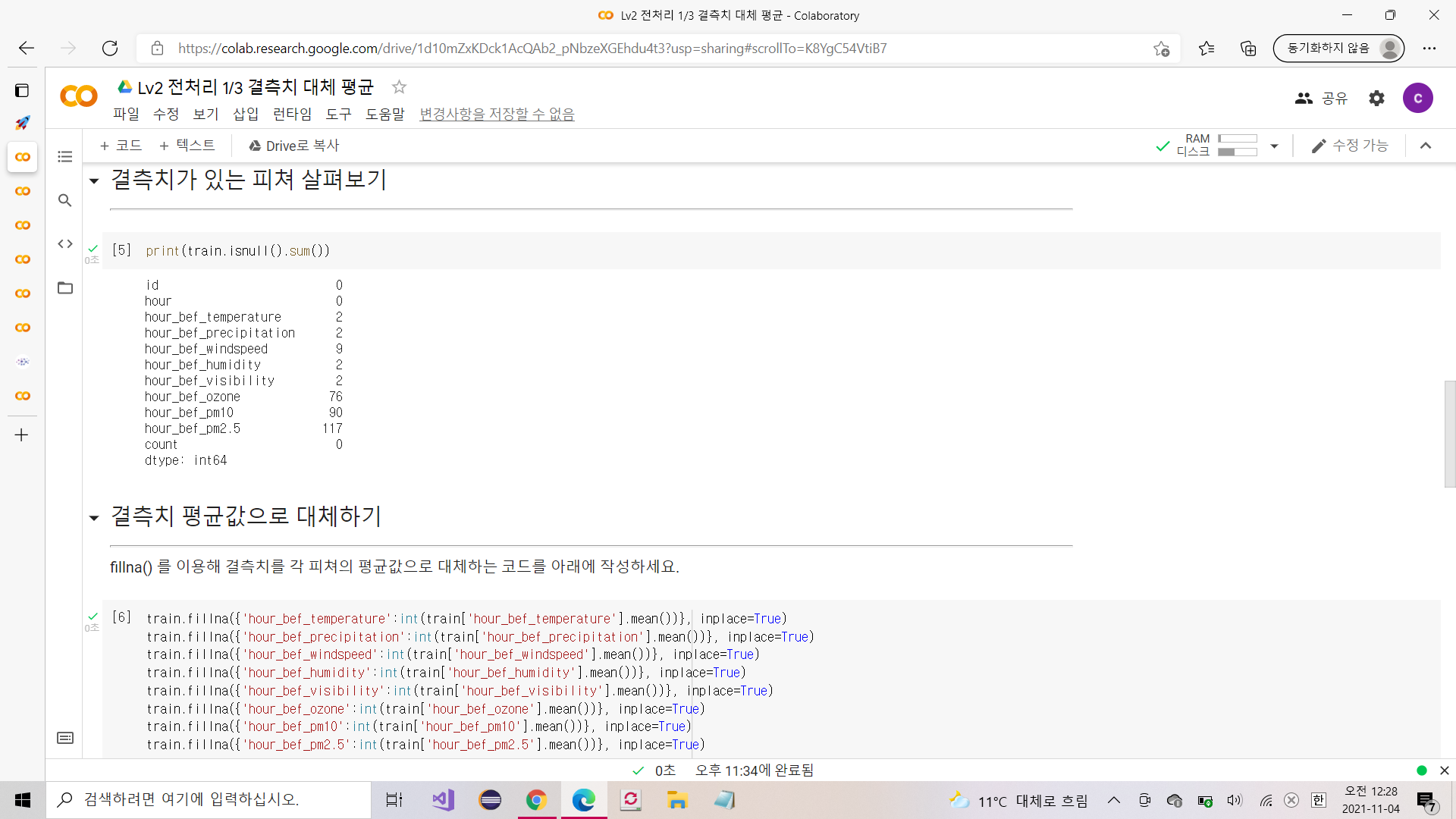 : 결측치 들을 각 피쳐의 평균값으로 대체하는 코드