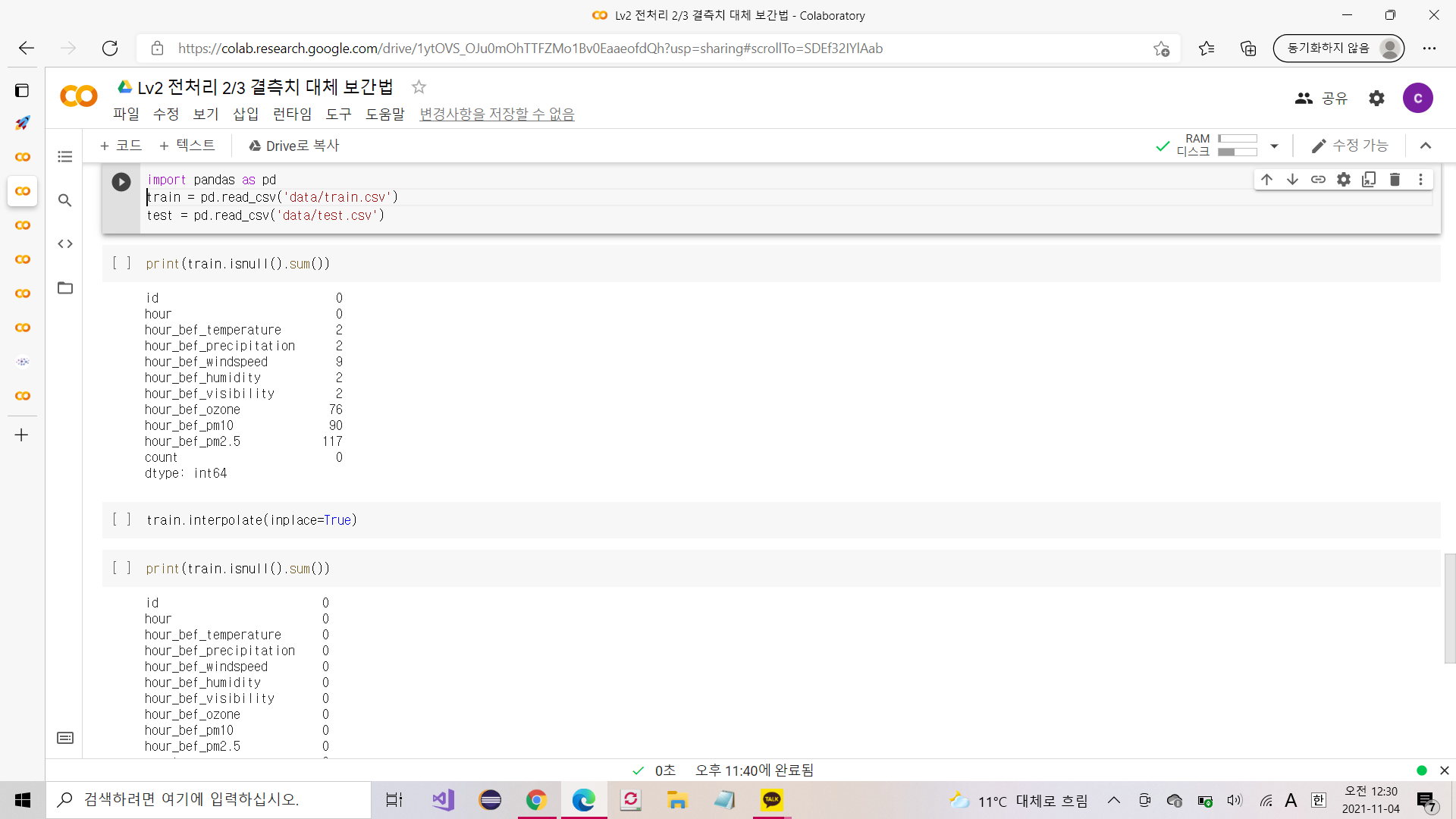 피쳐의 정보성을 강조하기 위한 보간법을 사용해 결측치 채우기