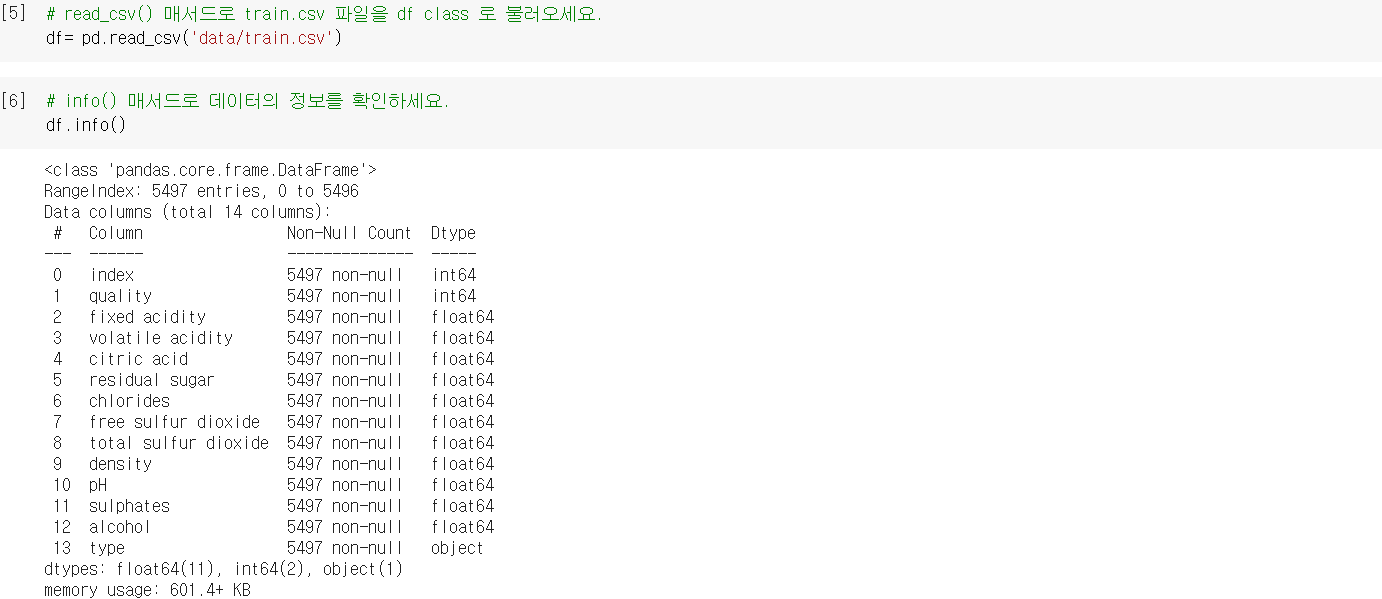 2) info() 메서드로 데이터의 피쳐수, 컬럼명, 결측치 여부, Dtype 정보 알 수 있음
