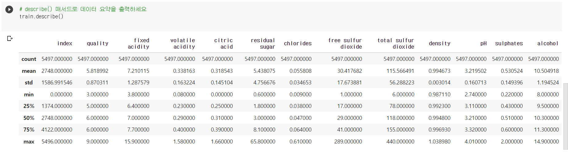 count, mean, std, min, 1분위 수, 2분위 수, 3 분위수, max값 출력