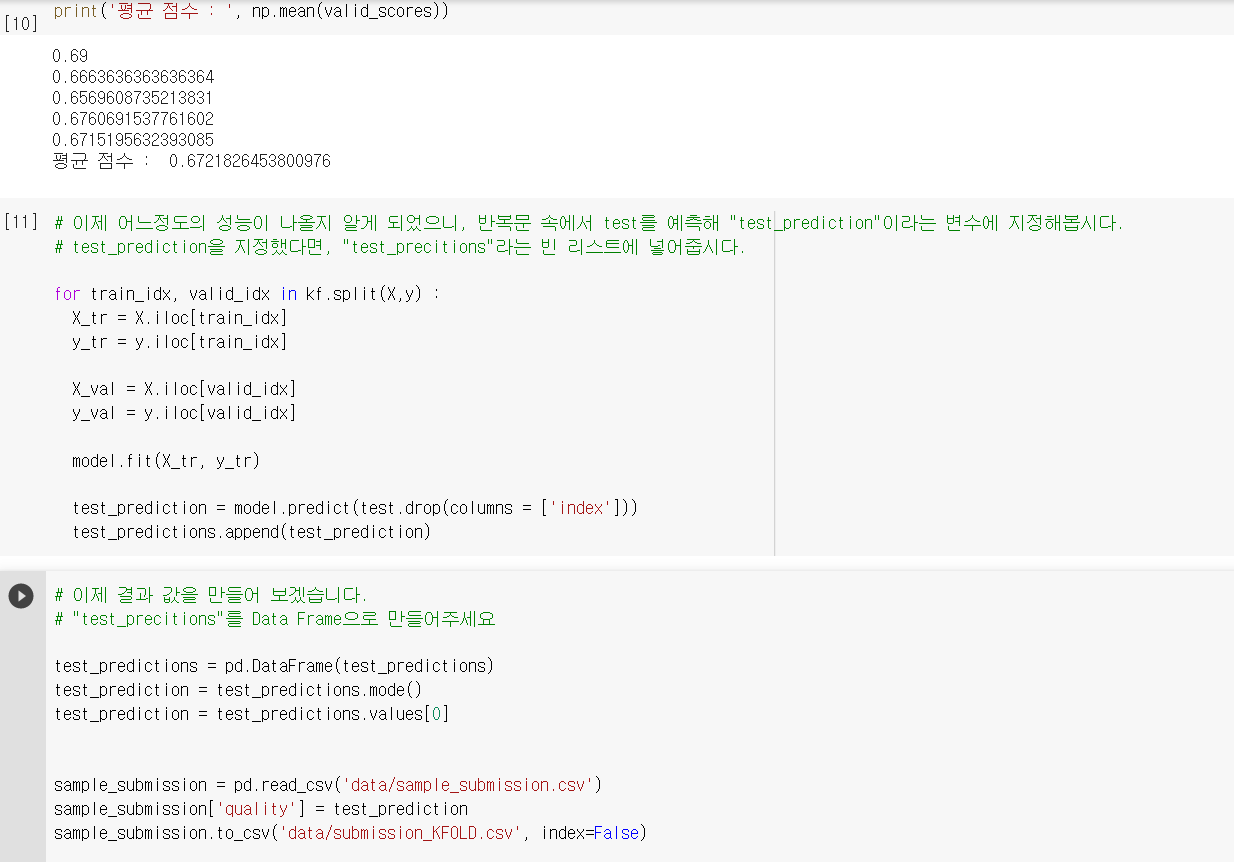 5. n_splits를 5로 설정하면 5개의 결과값들에 대한 '최빈값'을 이용해 가장 등장할 가능성이 높은 결과값으로 결정