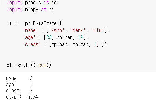 sum() : isnull() 뒤에 sum() 함수 추가하면 각 열 별 결측치의 수 확인 가능